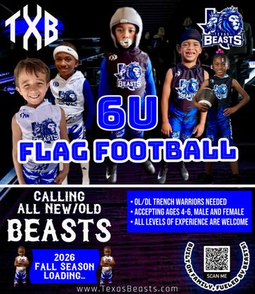 The Texas Beasts youth football team is a dynamic group of young athletes aged 4 to 12 years old who come together to learn the fundamentals of football while fostering teamwork and sportsmanship. Under the guidance of dedicated coaches, the Texas Beasts practice several times a week, honing their skills in a fun and supportive environment. Texas Beast competes in local & national leagues, promoting competitive spirits, confidence, personal growth, friendship among players & love for the game.
