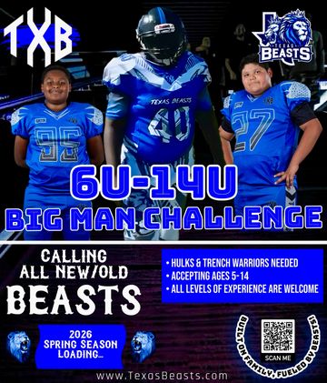 The Texas Beasts youth football organization is thrilled to announce our inaugural Big Man Challenge, a dynamic event designed for aspiring linemen aged 6 to 14. This challenge focuses on developing the fundamental skills, strength, and agility crucial for success on the offensive and defensive lines. Participants will engage in a series of competitive drills, including sled pushes, tire flips, obstacle courses, and technique stations, all under the guidance of experienced coaches.