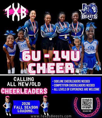 The Texas Beast youth cheer team is a lively group of dedicated young athletes, ages 4 to 14, who thrive on teamwork, enthusiasm, and spirit. Their expertly choreographed routines bring energy to local sports events and competitions. The team fosters inclusivity and friendship, ensuring every member feels valued regardless of skill level. Coaches focus on safety and technique while promoting personal growth. The cheer team creates a positive environment, teaching resilience.